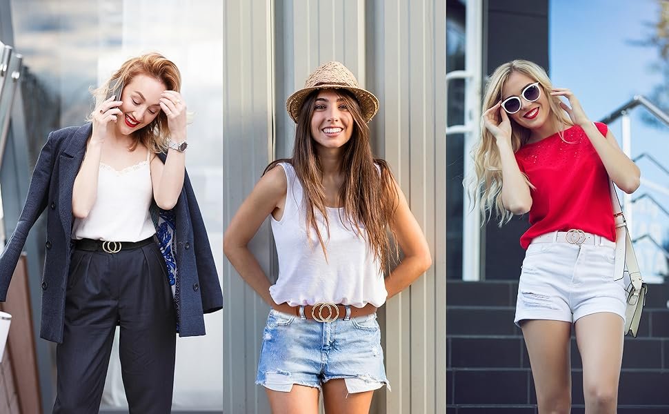 To begin with, the Double O Ring Buckle Women Belts feature a modern overlapping circle buckle in a polished gold finish. As a result, it instantly adds a fashionable highlight to any outfit. Whether paired with dresses, jeans, or outerwear, the eye-catching design helps elevate everyday looks with minimal effort.